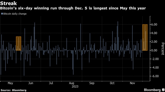 ビットコインは5日までに6営業日続伸し、同期間の上昇率は約16%となった。昨年の大幅安から持ち直し、年初来の上昇率は165%程度に達した。6日のアジア時間では上昇が一服している。