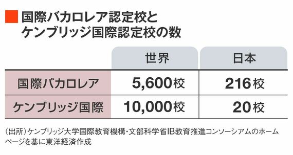 日本では、国際バカロレア認定校は216校あり、ケンブリッジ国際認定校等は20校・団体ある。一方、世界では国際バカロレア認定校は159カ国に5600校、ケンブリッジ国際認定校は160カ国に1万校ある。