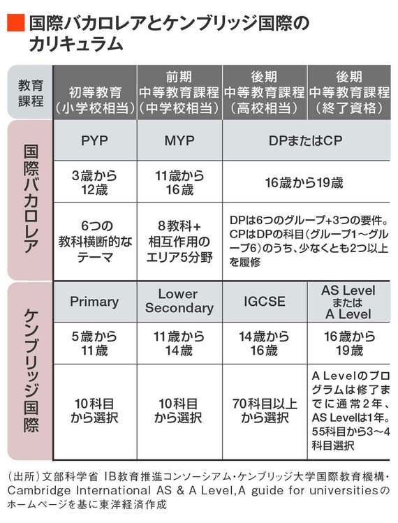 実際、都内のインターナショナルスクールの経営者は「国際バカロレアを検討したが、特定の科目に集中したカリキュラムは組めない。科目ベースのケンブリッジ国際を選んだ」と話す。