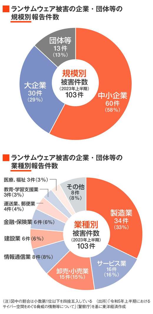 また、被害を受けた業種の内訳を見てみると、幅広い業種が攻撃対象となっており、感染経路はVPN機器やリモートデスクトップからの侵入が8割を超えている。