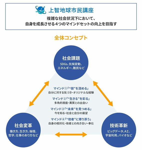 「24年4月に開講予定の上智地球市民講座は、『社会課題』『技術革新』『社会変革』の3つがテーマです。閉塞感や不安感が漂う現代において、『地球市民』としての生き方を前向きに捉え、自身の成長を促進させる学びをコンセプトとしています。3つのテーマに即したさまざまな切り口の講座によって、知見を深められる構成です」