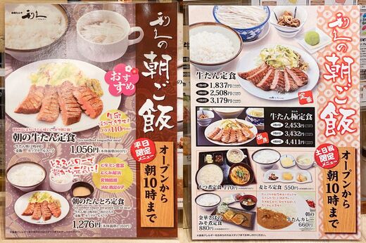 ※朝メニューとして記載されていますが、「牛たん定食」と「牛たん極定食」はレギュラーメニューと価格・内容共に同じものになっています。