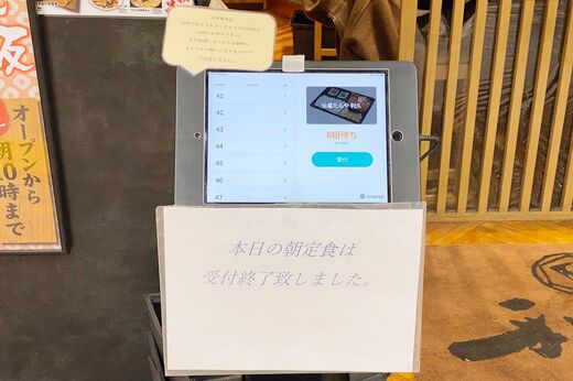 朝メニューの受付時間は本来10時までですが、あまりのお得さに「並んででも食べたい」と思う人が続出し、9時半すぎには「本日の朝定食は受付終了致しました」と書かれた用紙が貼り出されることも。