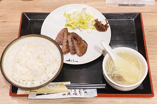 牛たん焼は単品注文すると、2枚4切で税込1342円。「朝の牛たん定食」は、単品の牛たん焼2枚4切に、麦飯とカップテールスープがセットなっているにもかかわらず、286円も安いんです。