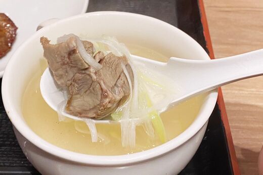 テールスープは大ぶりのカップスープにヒタヒタに入っていました。味付けはあっさり優しい塩味で、量が多いかとおもったけどするする飲めました。たっぷりの白髪ネギと、底には巨大なテール肉がごろり。口に放り込むと、ほろほろとほどけるほど柔らかく煮込まれていました。