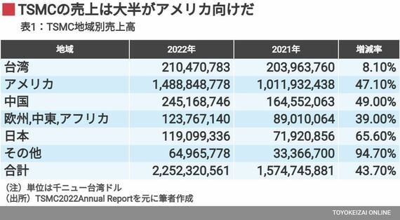 TSMCの2022年売上高は2兆2523億台湾ドル(約10兆6000億円)である。前年比44%増というすさまじい成長だ。その中で日本向けは地域別増加率で最大である66%増だが、TSMC全社売上比での割合は5.3%に過ぎない。
