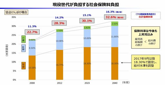 財政制度等審議会財政制度分科会の資料では、協会けんぽの場合、2000年の医療保険料率は8.50%だったが、2012年からは10.00%となっている。2040年の推計値は11.80%だ。