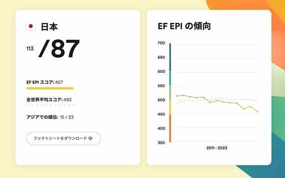 一方英語力はというと、イー・エフ・エデュケーション・ファースト(EF)が行っている英語能力ベンチマーク「EF EPI英語能力指数」で、世界113カ国中87位。5年連続で順位を落としていて、「英語力が低下している地域」の下位に該当する結果になっています。
