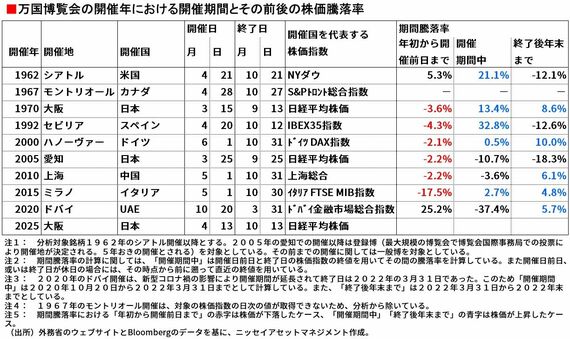 開催年を「開催前」「開催期間中」「開催後」の3つの期間に分けて、株価の動きを見ています。