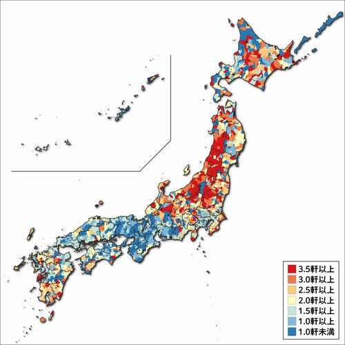 上図を見ると、東北地方や新潟県が「赤く」色づいています。これは『家計調査』での支出額と同じ傾向です。県庁所在地と政令指定都市では山形市がトップ(1万人あたり4.3軒)。次いで、富山市、金沢市、青森市、盛岡市、秋田市など、東北、北陸の都市が上位を独占しています。