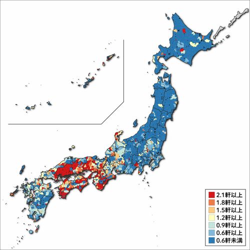 下図は「あるジャンル」の飲食店の数(昼間人口1万人あたり店舗数)を可視化したものです。中国地方から近畿地方にかけて「赤い」地域が広がっていますが、いったい何のお店でしょうか……?