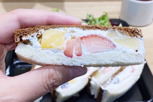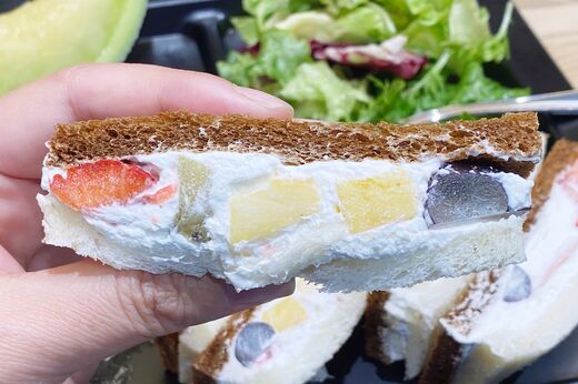 一口目には「なんだ? 思ってたよりパンが硬いぞ」と思ったのですが、型崩れを防ぐ意味があるのだと気づきました。フルーツをたっぷり使用しても、水分が少なめのパンで挟めば、持ってもふにゃふにゃしないので、生クリームが飛び出したり、フルーツがこぼれず手が汚れません。