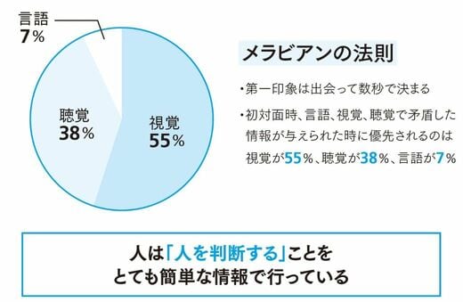 ①で印象を決めたとしても、言動までデザインしない限りは、周囲が認知することはできません。決めた印象を与えられるように「メラビアンの法則」にある「視覚情報」「聴覚情報」「言語情報」の3つの情報を決めましょう。