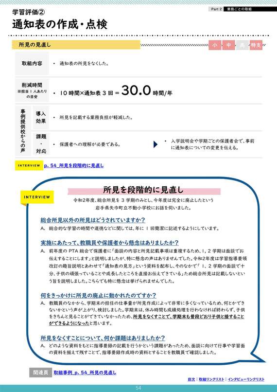 通知表の見直しが議論になっているのは、教員にとって、そうとう負担が重いからだ。ラフな推計だとは思うが、所見の作成で、1学期あたり10時間くらいはかかっている(1人の教員当たり)、と文部科学省の事例集では見積もっている。道徳や総合的な学習の時間、またトータルの総合所見の欄はコメントを書くのが一般的で、大型書店では例文集がたくさん売られている。