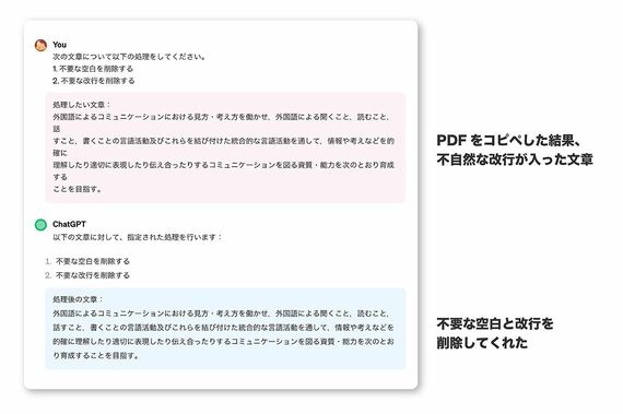 例えば、皆さんは、学習指導要領などのPDFファイルをコピー&ペーストしたときに、不要な空白や改行が入ってしまった経験はありませんか。そんなとき、ChatGPTにお願いをすれば、きれいに整えて出力してくれます。