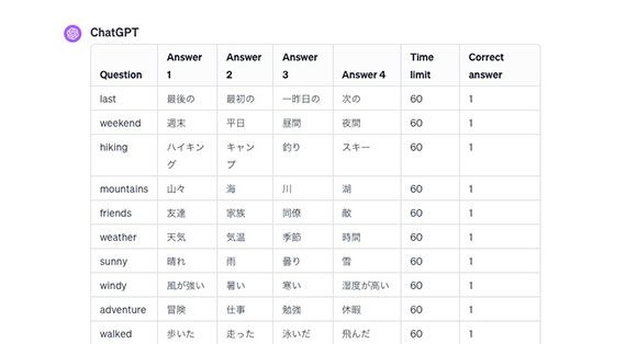 さらにKahoot!には、テンプレート(Excelファイル)から問題を作成する機能があります。上のプロンプトで作成した表は、このテンプレートに準拠しているので、出力結果を貼り付けるだけで、すぐにKahoot!の問題として取り込むことができます。
