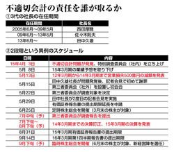 だが、調査は収束しない。5月15日には、元東京高等検察庁検事長の上田廣一弁護士を委員長とする、社外中心の第三者委を新たに設置。インフラに絡む工事 進行基準の案件のみならず、テレビやパソコン、半導体の3事業を、第三者委は対象項目に加えた。販促費の計上や棚卸資産の評価などが、その妥当性を疑われ たのである。対象期間も2011年3月期から2015年3月期まで拡大することになった。