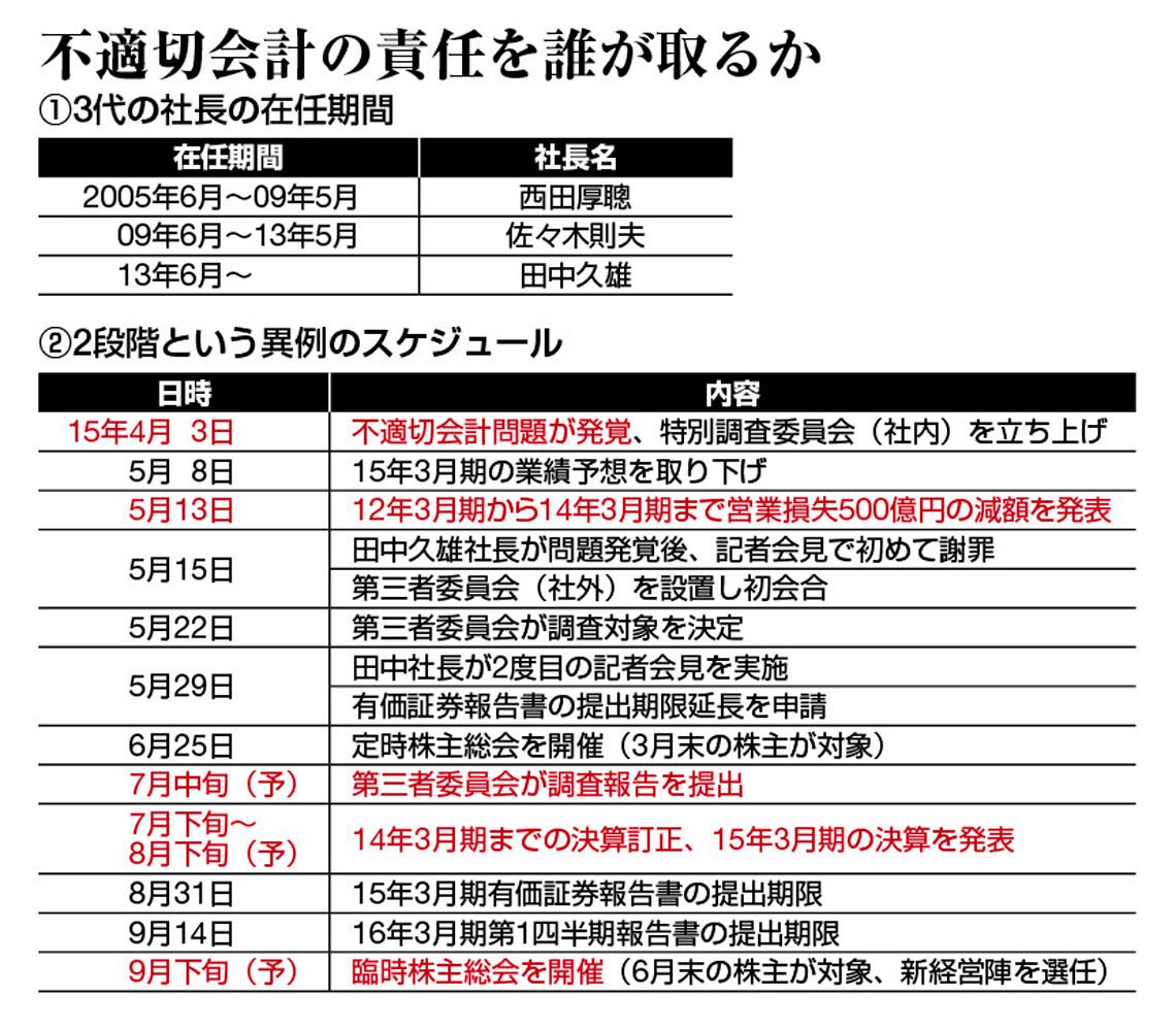 発端は4月3日だった。東芝では一部のインフラ事業で不適切な会計が発覚、社内で特別調査委員会を立ち上げた。続く5月13日、特別調査委の調査を受け、2012年3月期から2014年3月期まで営業損失として計500億円強を減額する、と発表。不正の原因に「予算達成目標の位置づけが高かった」ことを挙げた。