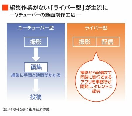 一般的なユーチューバーと同じ「撮影→編集→投稿」というやり方では、編集作業に大きな労力がかかる。一方のライブ配信であれば、編集自体が必要なくなるため、作業効率が大幅に改善される。カバーのようなVチューバー事務所は所属タレント向けに配信用のアプリを開発・提供しており、そのアプリを使用してタレントが簡単にライブ配信を行える。
