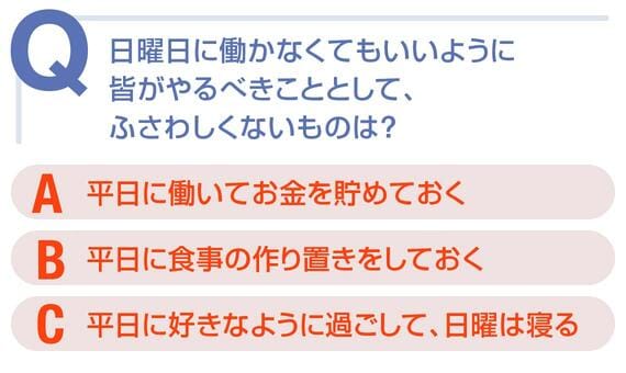 一方で、働く「人」に注目した経済の捉え方は、私たちが今生きている空間=社会の中で、働く人がいるから生きていけるという考えです。私たちは1人では生きていけず、毎日、数千、数万の人に支えられています。先ほどのクイズは、自分1人なら「A平日に働いてお金を貯めておく」もふさわしいですが、周囲の空間=社会のことを考えれば、日曜日に働く人がいなくなりますから生活が回りませんよね。ですから、皆がやるべきこととしてはふさわしくないのです。実は年金問題も同じで、一口に多くの人がお金を貯めれば解決する問題ではありません。皆がお金を使わなければ景気が悪くなり、給料も上がらず、年金の掛け金を収められません。お金を考える際は、働く「人」に注目して「社会」を見つめることも重要なのです。