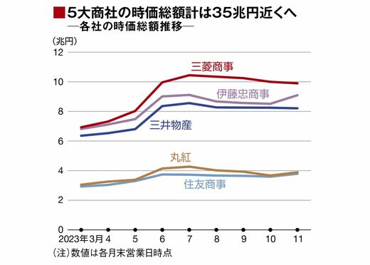 「投資の神様」といわれるウォーレン・バフェット氏が来日し、5大総合商社株の保有比率引き上げを公言したのは2023年4月。3月末に26兆円余りだった5大商社の時価総額合計は、11月末時点で35兆円近くにまで膨れ上がっている。