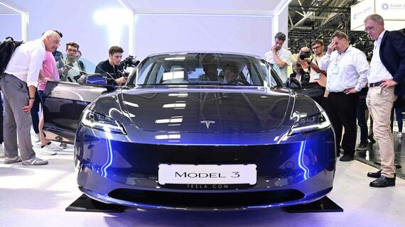 2023年、ドイツでの「IAA」に出展したテスラのEV 「モデル3」。欧州の人々からも注目を浴びた(写真:AFP=時事)