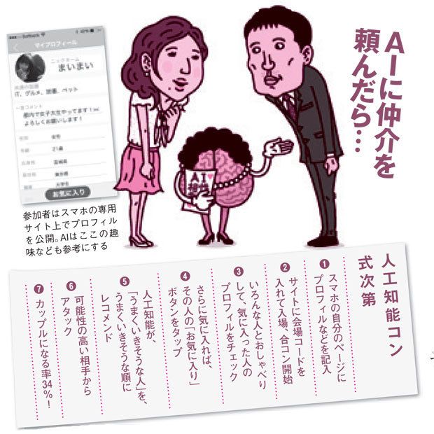 てことは、将来は占師の失業か。いやそれより、問題はその「うまくいきそうな相手」をAIが見つける仕組みだ。グーグルが検索結果を出すときなどにも使われる、ランク付けのアルゴリズムを応用。どれだけ人気があるかなどで参加者をランク付けして、マッチングの材料としているらしい。して、AIから学んだ、合コンの極意は?