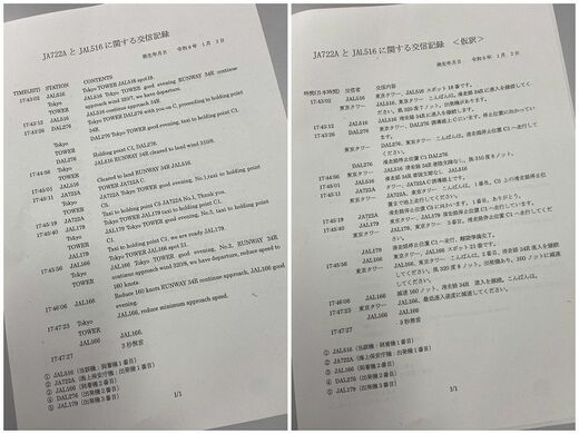国交省が公表した交信記録。右側は仮訳(編集部撮影)