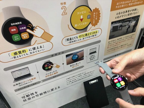 特徴は、目的地設定が簡単で感覚的にすぐ使えること。例えば、画面上に「病院」「公民館」「コンビニ」「自宅に帰る」という4つのアイコンを設け、歩行中にルートから外れたら音や振動で知らせると同時に、画面上にわかりやすい案内表示を出すなどだ。
