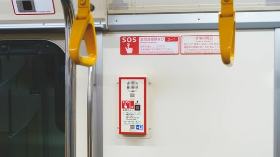 客室内やドア付近に設置されている車内警報装置(SOSボタン)は緊急事態が発生した際にお客さまに押下し乗務員に通報していただきます。一部の車両を除き、SOSボタンが押されると、乗務員と通話することができます。