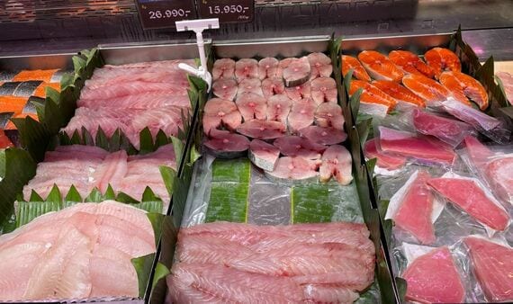 世界全体の水産物需要は増加を続けています。この写真は、タイの市場でのものです。地元の鮮魚とともに、解凍された大西洋サバ(ノルウェーサバ)が売られています。