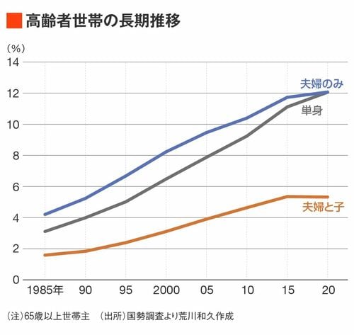 夫婦のみ世帯の割合が増えているのは、若い夫婦ではなく、子育ても終了し、子どもが独立して夫婦だけに戻った高齢夫婦が増えているからです。