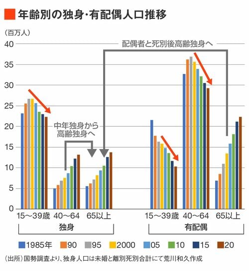 残念ながら、どんな少子化対策をしても出生の絶対数は増えません。婚姻減も出生減もそもそもその対象年齢人口の減少が前提としてある以上不可避なものです。高齢独身人口が増えることもまた、現在の人口構造から見れば必然の未来です。