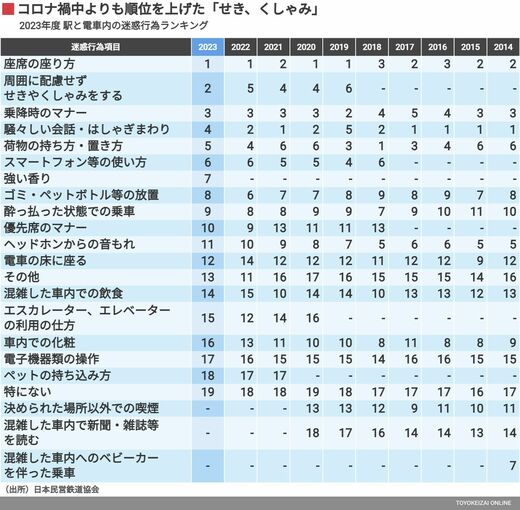 6位は「スマートフォン等の使い方」で2022年度と変わらない。7位は今回から新設された「強い香り(香水・洗剤・柔軟剤・化粧品等)」がランクインした。昨年度のランキングでは11位「その他」の内訳として、「柔軟剤や香水のきつい香り」が含まれていた。今回はこの項目が独立して設けられ、いきなりの7位。来年度以降、この項目はどのように順位を上げ下げしていくだろうか。