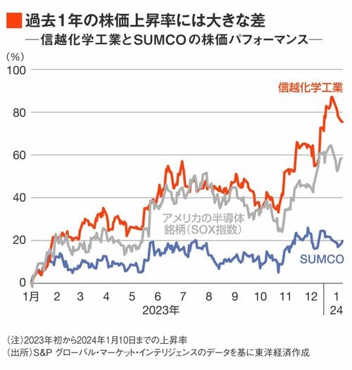 半導体チップは超平坦に加工した円盤状のシリコンの板に回路を形成し、切り分けて作られる。この円盤状の基板であるシリコンウェハーで「世界2強」なのが日本企業の信越化学工業とSUMCOだ。だが、株価の上昇率では明暗がくっきり分かれている。