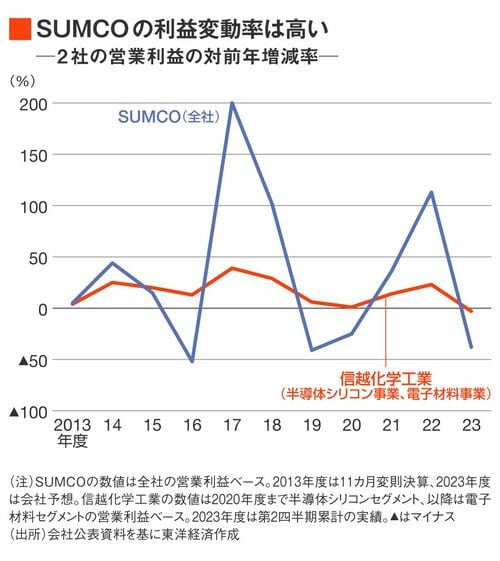 利益の安定性の違いは一目瞭然。信越のウェハー事業は、半導体市況で数年おきに繰り返す「シリコンサイクル」の谷の時期であっても安定的に利益成長を続けている。対するSUMCOの業績は、好不況の波に大きく影響されて極端に変動している。