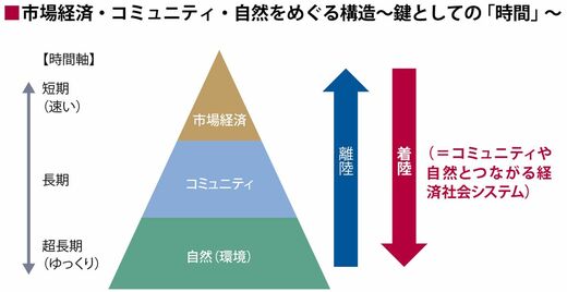 しかし特に近代社会以降においては、コミュニティから個人が独立していくとともに自由な経済活動を広げていき、そこに「市場経済」の領域が大きく開けていった。これがピラミッドの一番上の次元であり、以上のように、私たちの生きる世界は「市場経済-コミュニティ-自然(環境)」の3層構造からなるものとして把握することができるだろう。