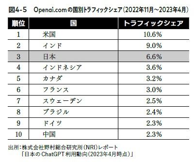 図4‐5のように、ChatGPTへのアクセス数が多い国は、アメリカ、インド、日本の順番です。アンケート調査によってはChatGPTを使っている日本人は少ないというデータもありますが、「アクセス数」がデータとしてはもっとも客観的です。そこを見る限り、日本は世界3位です。