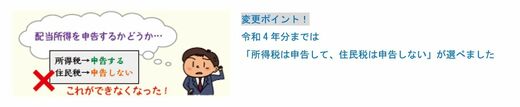 令和5年の申告分から、上場株式等の配当や譲渡所得などに係る課税方式については、所得税と住民税を一致させることになりました。つまり、所得税の額を決めるために所得を申告すると、その金額が住民税の算定にも利用されるということです。