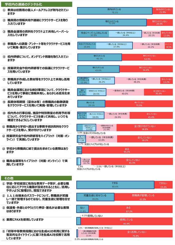 また、紙ベースが多いのは、教職員間もそうだし、学校と教育委員会の間もだ。例えば、出張費の精算で交通経路を教員は手書きでメモして事務職員がシステムに入力しているといった例もたまに聞く。DXなどと言う以前の学校、教育行政がまだまだ多いことが今回の調査からもわかる。