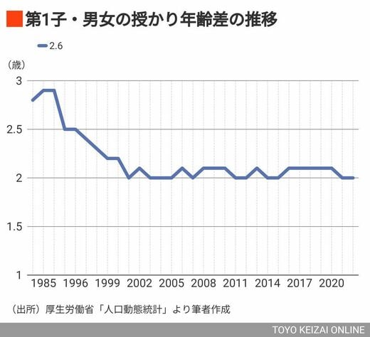 今の50代男女が20代だった1980年代半ばから1990年代半ばでみると、男女間の第1子授かり年齢差が2.5歳~2.9歳と約3歳差ありました。しかし、この年齢差も1990年以降年々低下して、2001年からは2.0歳~2.1歳で20年以上固定化されています。