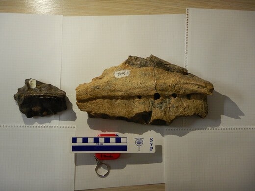 すでに歯は抜け落ちてしまっているが、歯の収まっていた歯槽が合計で8個残されていた。残された上顎骨の長さは24.2センチ。欠けてしまっている部分の長さも考慮して推定すると、元々の長さは46センチほどだったと考えられる。