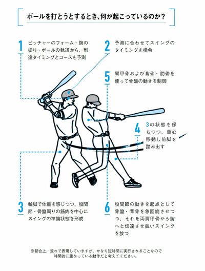 ボールをとらえ、打ち返すまでにバッターは次のような一連の動作をしています。