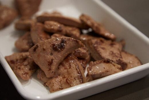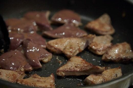 フライパンにサラダ油を小さじ2入れ、レバーを上下ひっくり返して焼きます。表面に少し焼き目がつくくらいが目安です。焼きすぎると固くなるのでご用心。