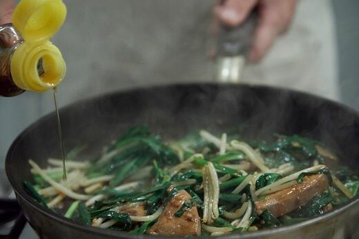 風味づけのごま油もやはり鍋肌からタラ~り(写真:吉澤健太)