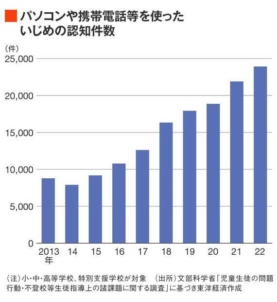 文科省の「児童生徒の問題行動・不登校等生徒指導上の諸課題に関する調査」によれば、いじめの態様別状況においてパソコンや携帯電話等を使ったいじめの認知件数は全体で2万3920件と、増加傾向にある。