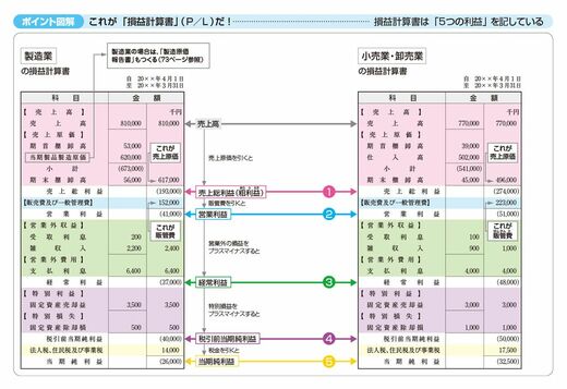 まずはとっつきやすい「損益計算書」から見ていきましょう。売り上げや受取利息などを「収益」、仕入れやさまざまな経費を「費用」といいます。損益計算書は、会社の1年間のすべての取引のうち、収益と費用をまとめて、「利益」を計算することが目的です。収益-費用=利益(儲け)です。損益計算書では、この利益を下記の5つに分類しています。
