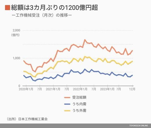 2023年12月の受注総額は1270.9億円。前月比9.7%増で3カ月ぶりに1200億円を超えた。6、9、12月と3カ月ごとに、まとまった受注が入っており、四半期ごとの減少幅は小幅に収まっている。とはいえ、前年同期比はマイナス9.6%と、12カ月連続で減少しており、調整局面はなお続いている状況だ。