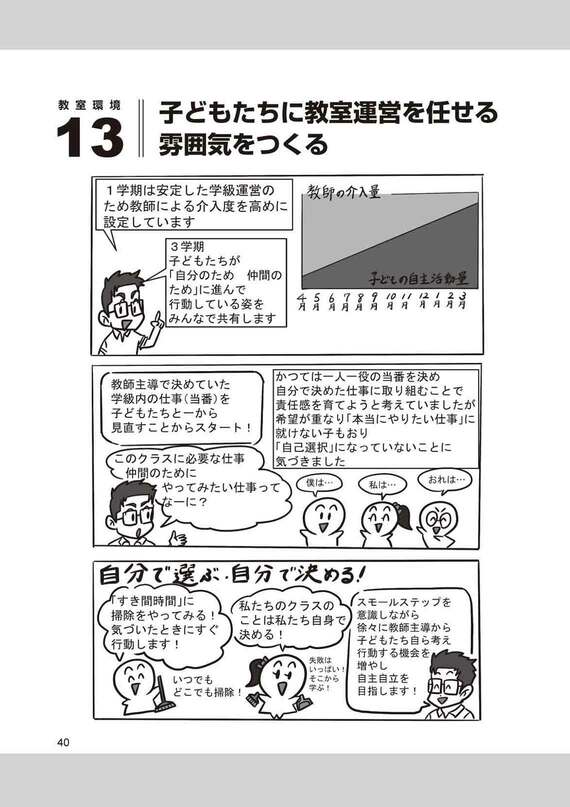 そのための目標と具体的な取り組みを『マンガでわかる!小学校の学級経営 クラスにわくわくがあふれるアイデア60』ではほかにもたくさん紹介しています。
