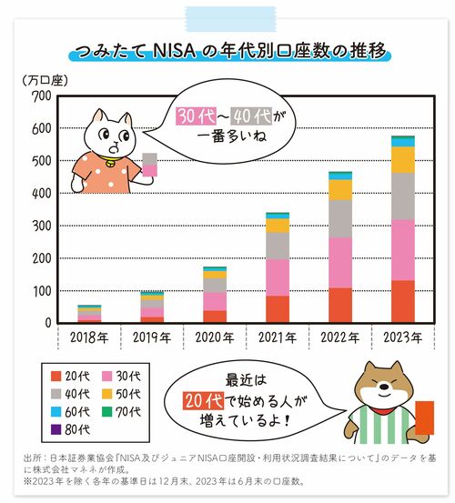「つみたてNISA」の非課税制度は2018年1月から始まりましたが、グラフが示すように、近年急激に利用者が増えています。また、幅広い年代で「つみたてNISA」という非課税制度を活用する人が増えてきたこともわかるでしょう。